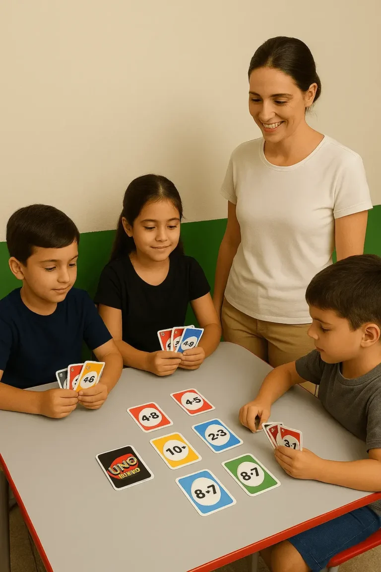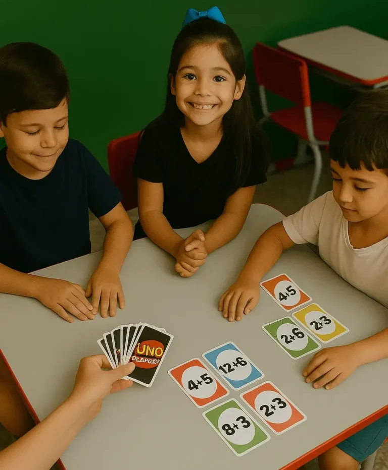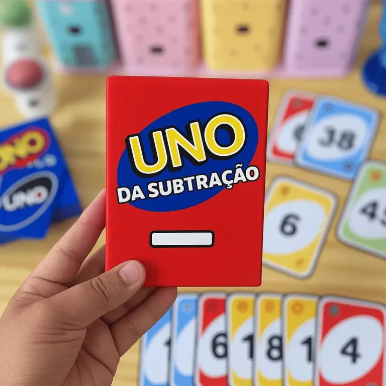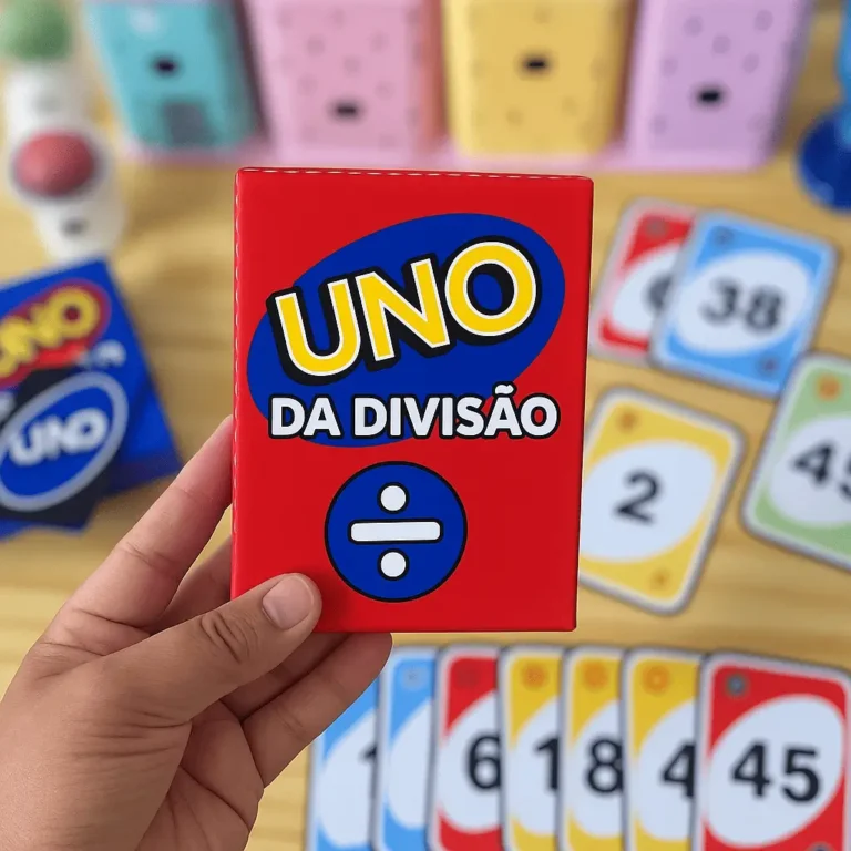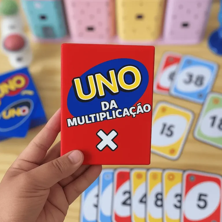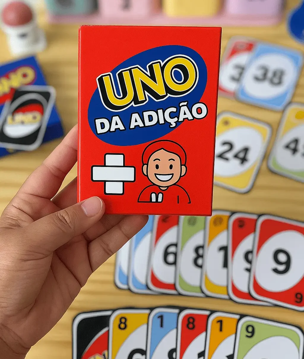 É um material digital em PDF com 4 versões do clássico jogo UNO adaptadas para ensinar adição, subtração, multiplicação e divisão de forma divertida.
